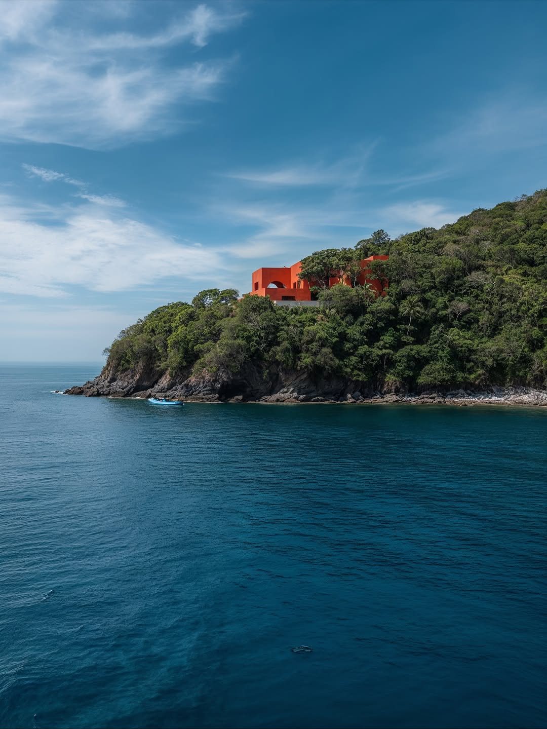 a contemporary architectural masterpiece in Mexican Brutalist style, perched on a cliff overlooking the Pacific Ocean — where form, color, and nature blend dramatically