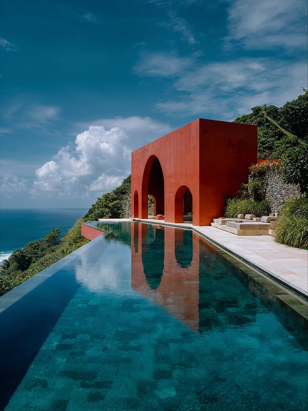 Located between the green forest and the deep blue ocean, the house is like a giant sculpture rising from the cliff, reflected on the surface of the infinity pool stretching out to the horizon.