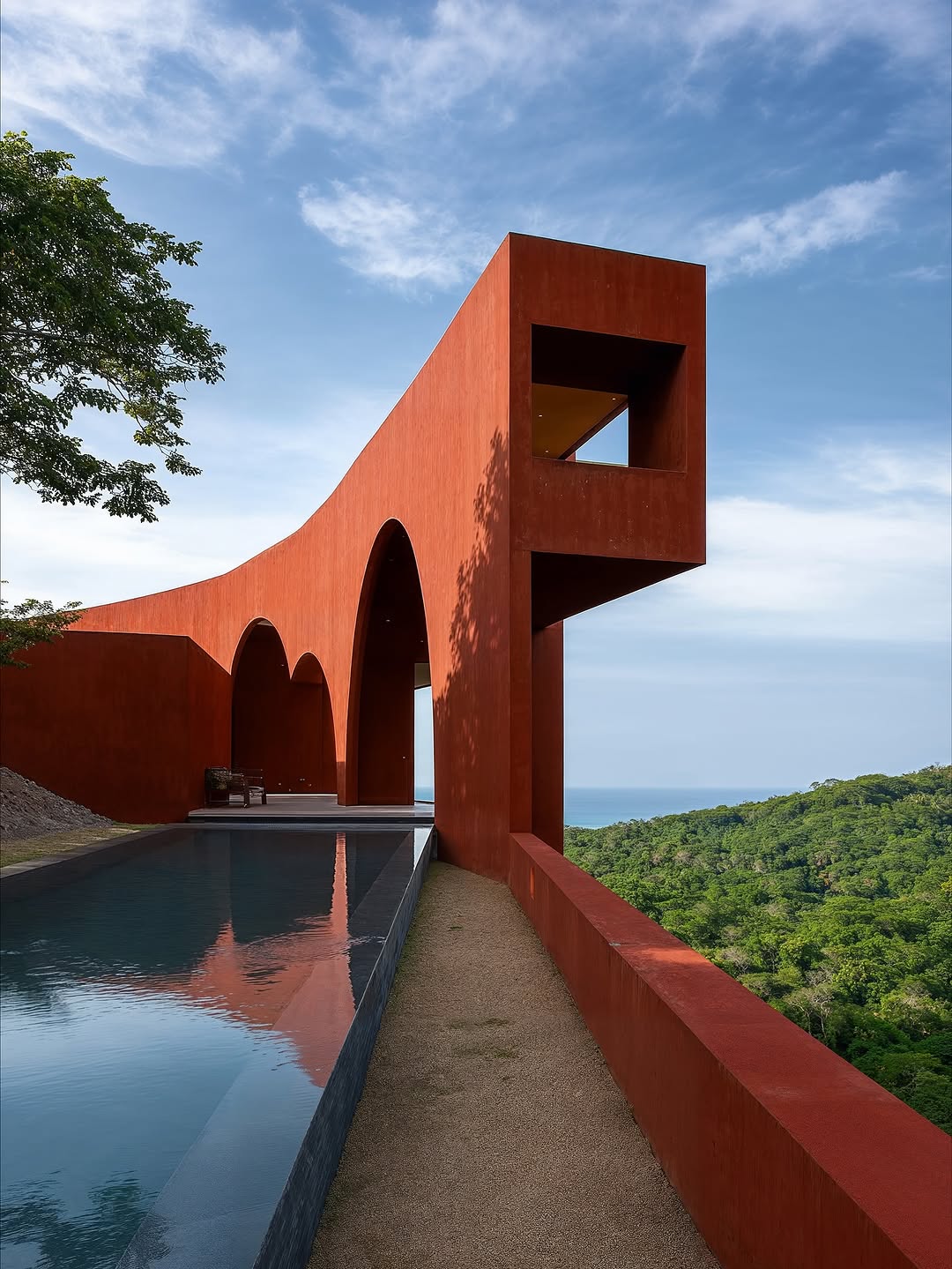 The project makes a strong impression with its Terracotta Red-coated concrete blocks — a color reminiscent of ancient Mexican and Mediterranean architecture. The curved arches, square blocks, and sharp planes are boldly arranged, creating a strong visual effect as sunlight and shadows alternate throughout the day.