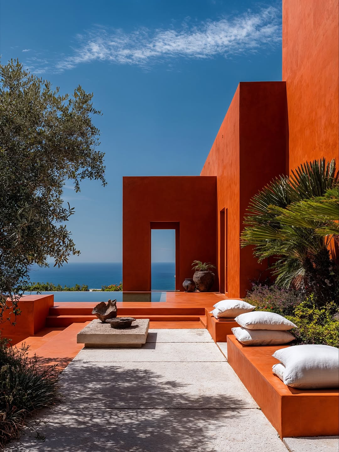 • Custom-designed furniture: monolithic stone tables, minimalist white sofas, hand-crafted ceramic vases evoke the local atmosphere.