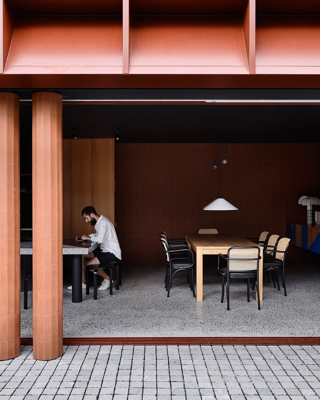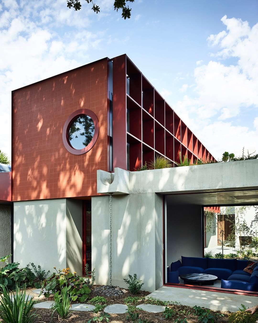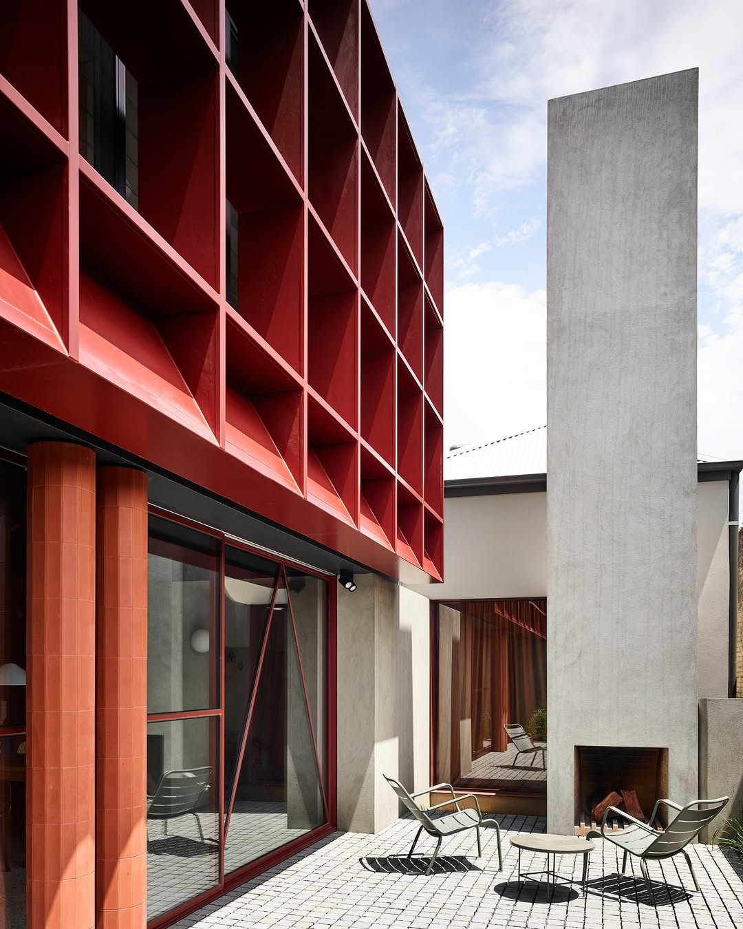 This house is a bold innovation from the double-fronted Victorian house, recreated in a modern way but still keeping the historical spirit. The project impresses with its unique red architectural block, the steel brise-soleil system that both blocks the sun, creates privacy, and brings visual depth to the entire facade.