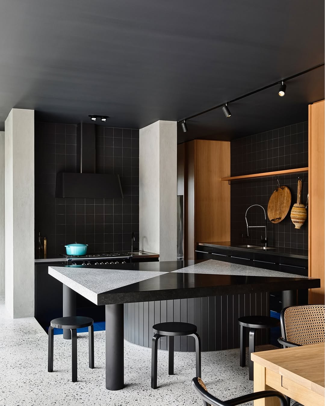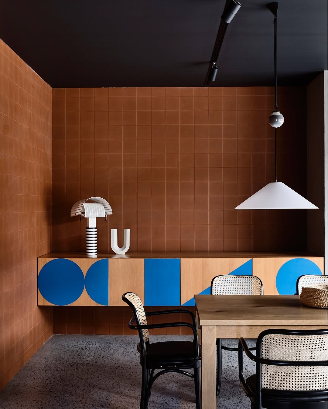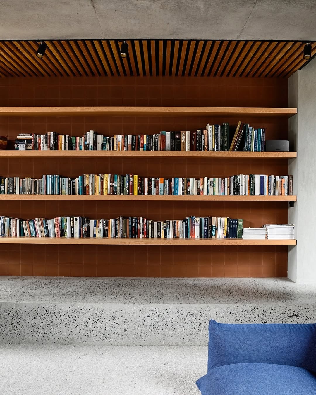 Inside, the living rooms are designed with raw materials: polished concrete, baked bricks, wooden ceilings - perfectly blending with minimalist interiors. The living space opens out to the garden, the reading room with its impressive long wooden shelves, the mid-century dining room and the kitchen with its strong geometric shapes create a unique living experience, full of design.