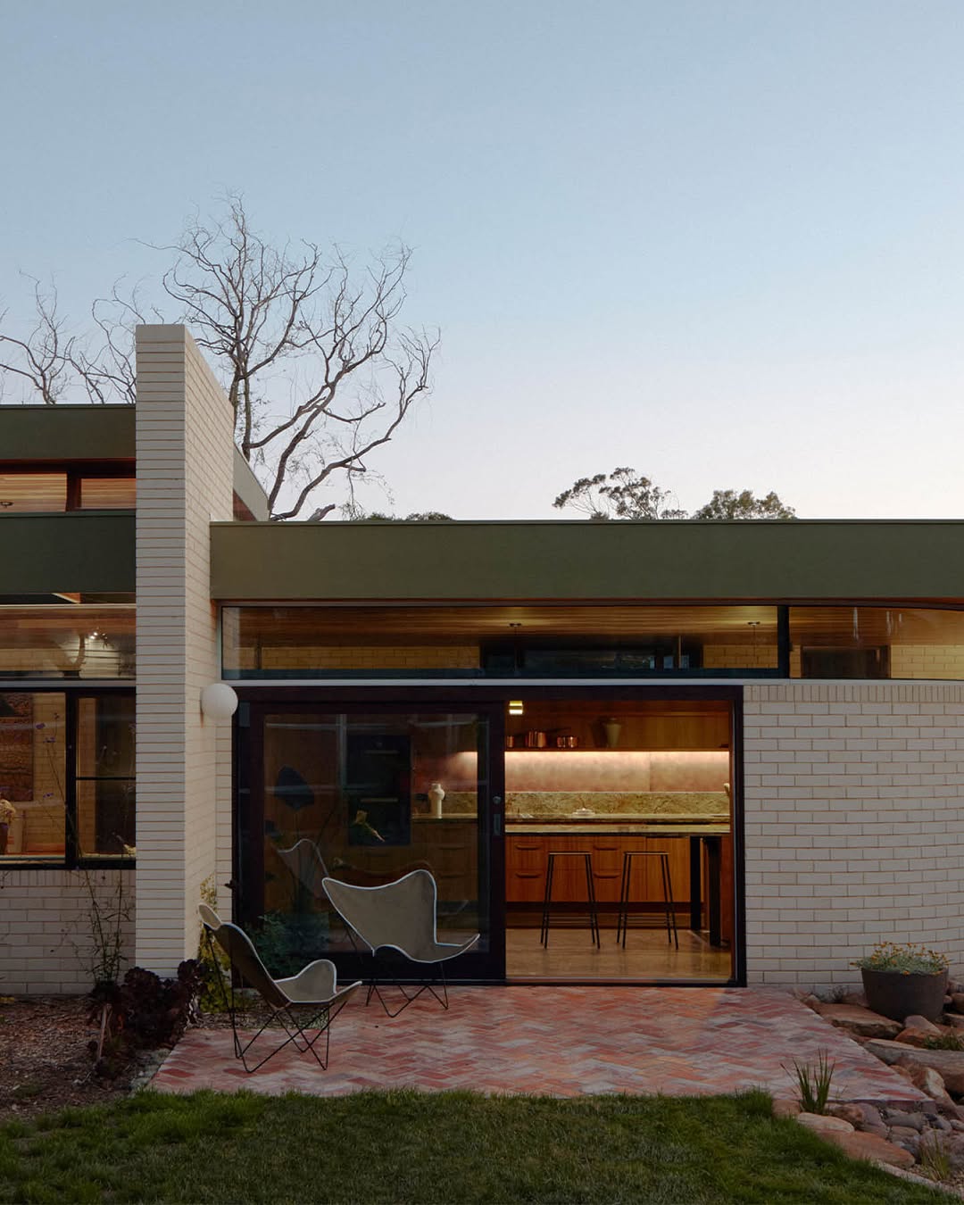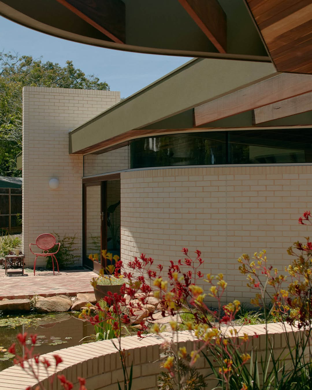 This house is a modern statement inspired by mid-century modernism, set amidst a lush garden and tranquil natural landscape. Light-colored brick walls, flat roofs and a long glass door system create a minimalist yet profound shape, expanding natural light into every space.