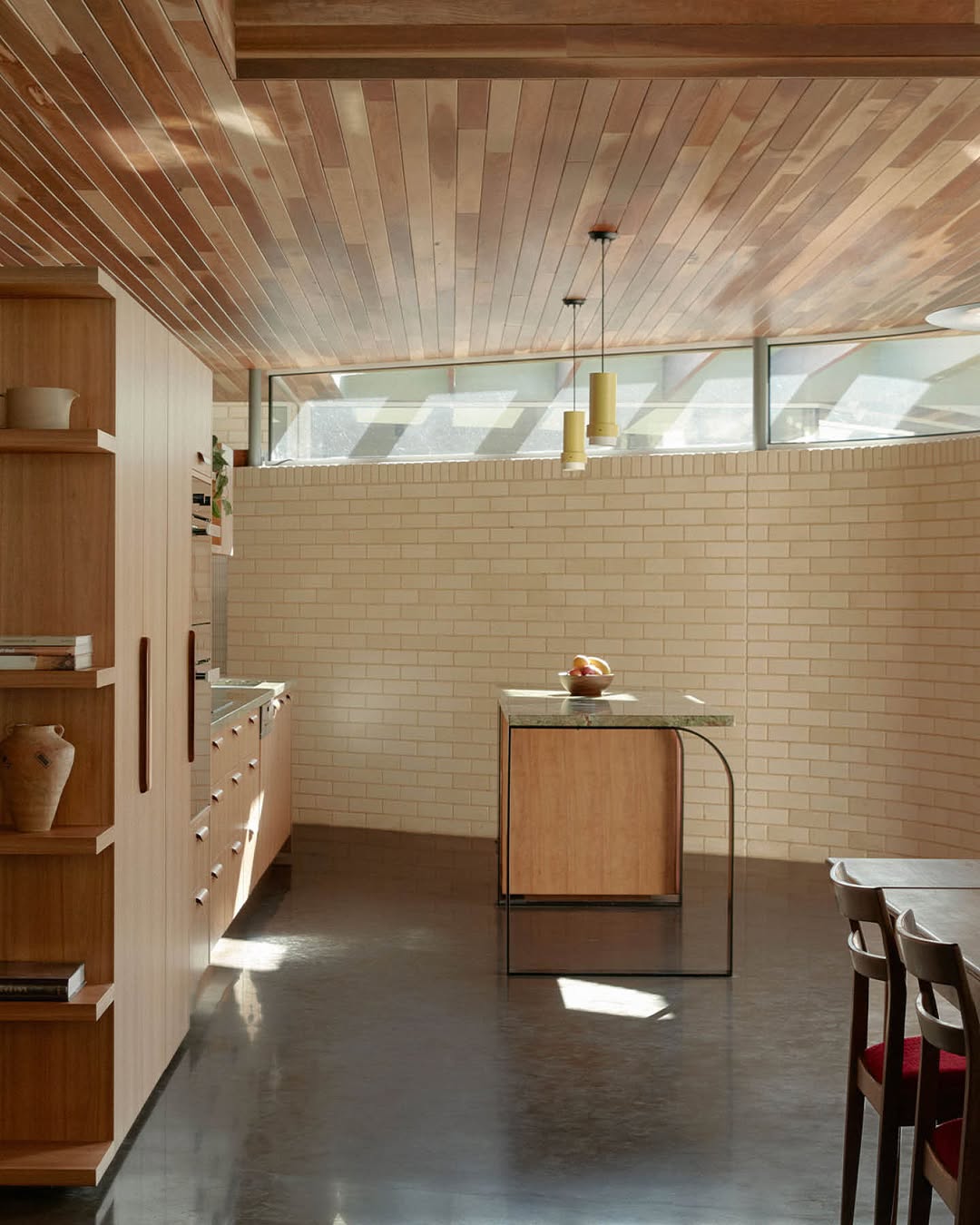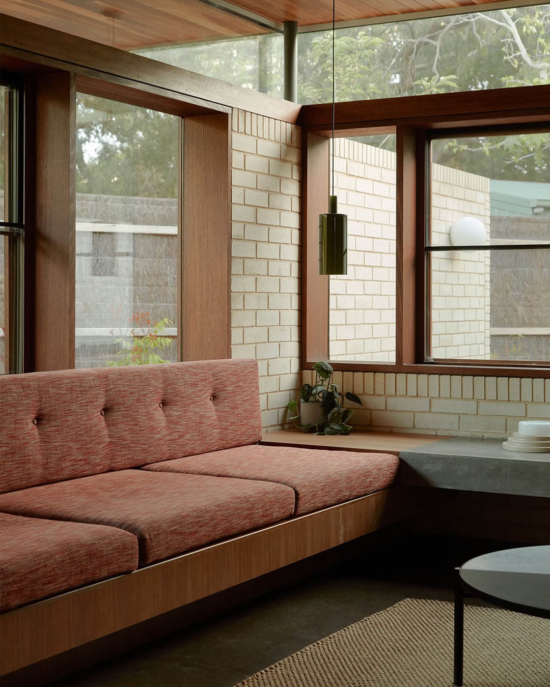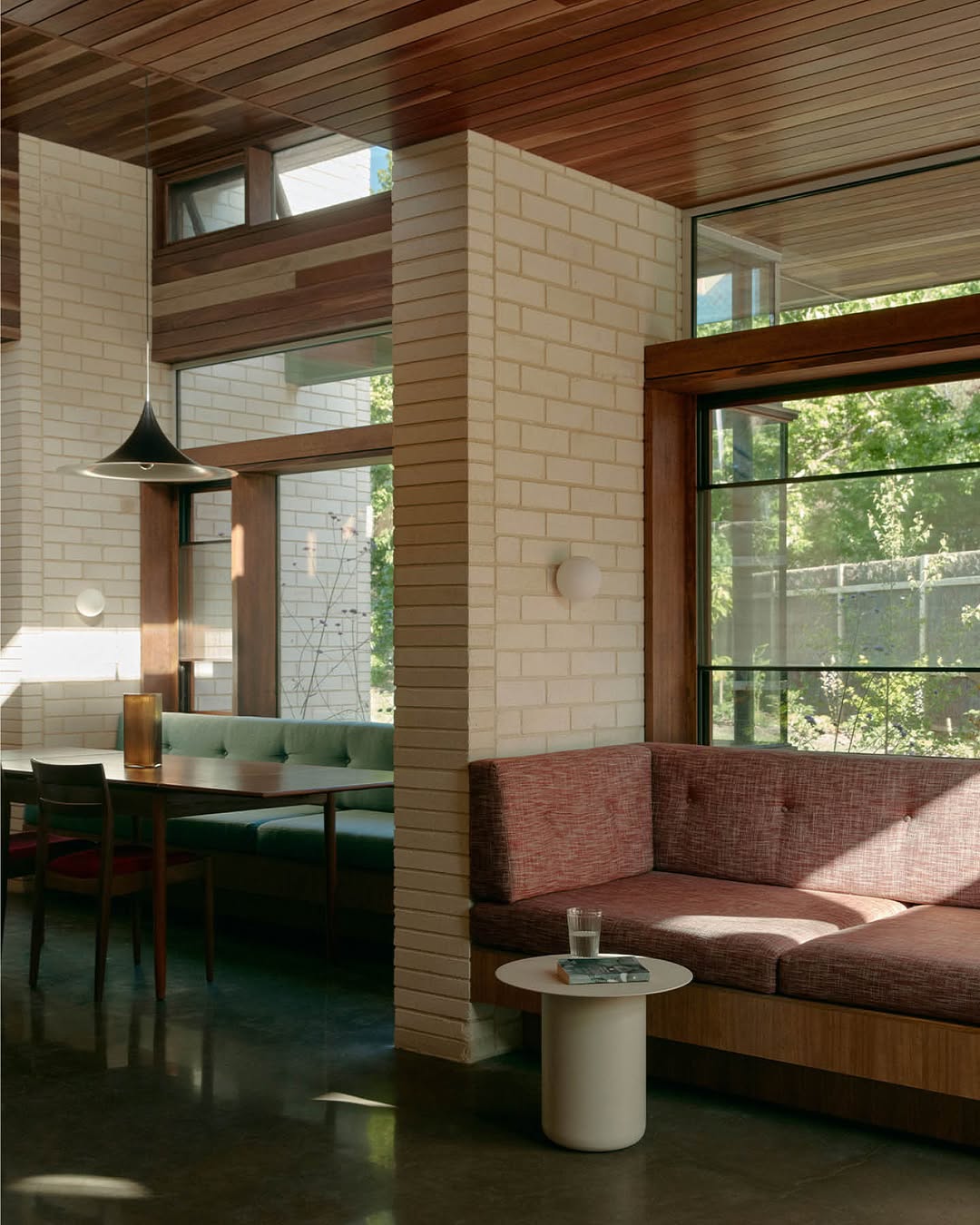 Inside, the warm interior with natural wood, wooden ceilings and high glass panels close to the ceiling keeps the house bright, airy and directly connected to the garden outside. The built-in seating arrangement, gentle pastel colors, and light through the roof gaps create a very “soft”, sophisticated and relaxing living space.