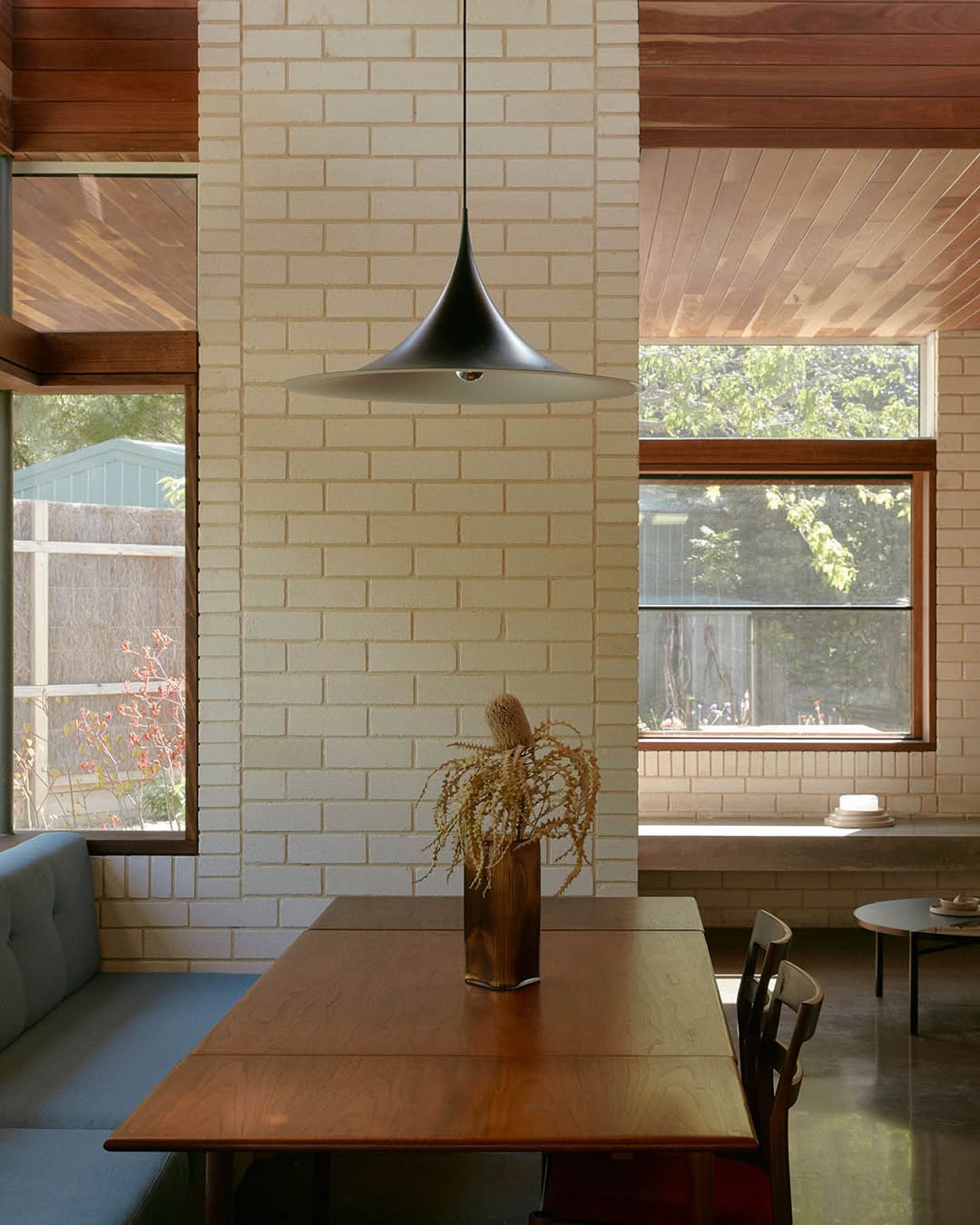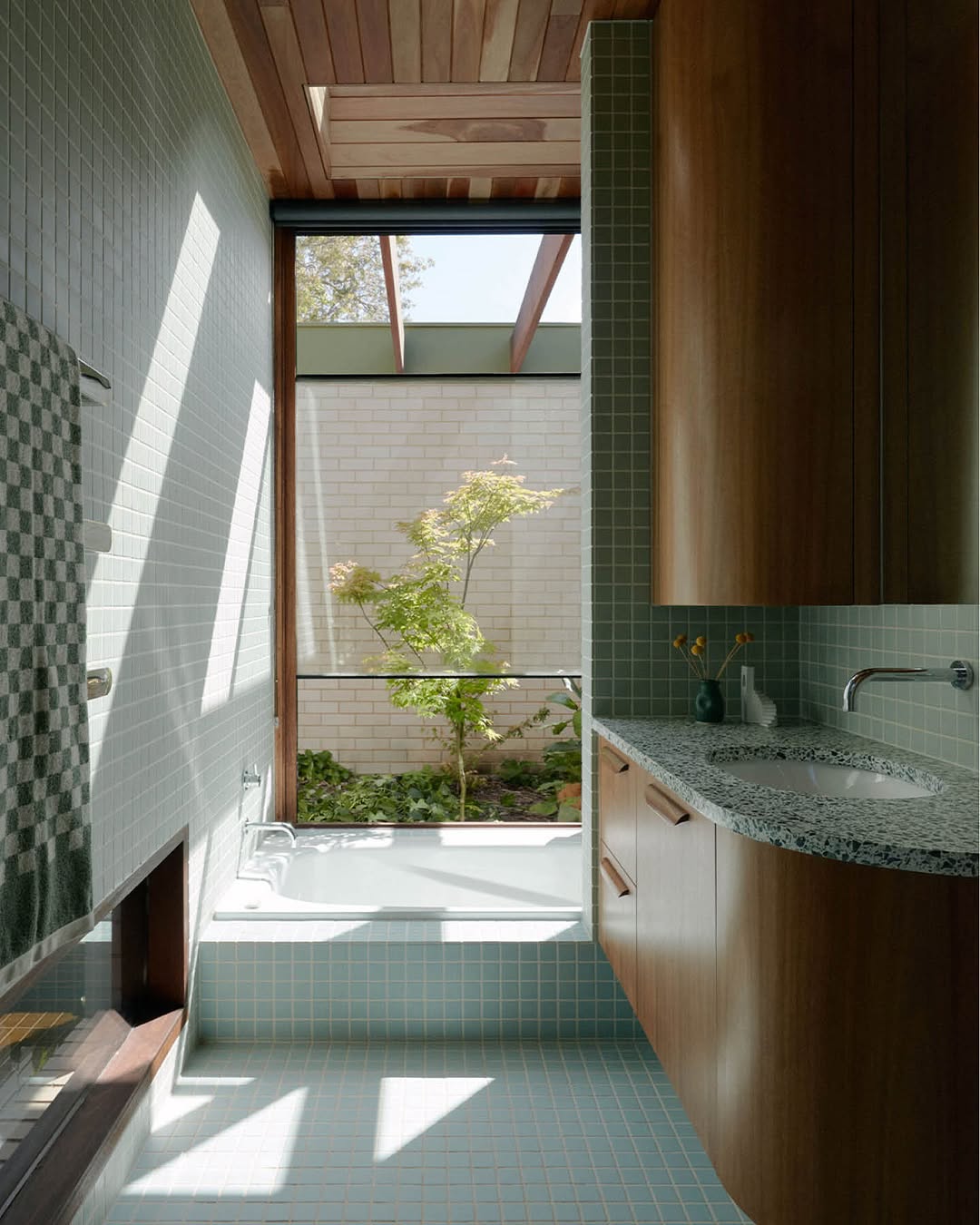 The kitchen - dining room has a mid-century spirit, rustic but no less elegant; the bathroom is a miniature spa corner with natural light and private green space. All blend together to form a modern, rustic beachside house, touching the right feeling of peace.