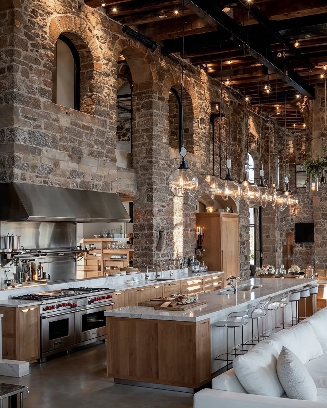 The spacious and majestic kitchen with a marble island and oak cabinets, high-quality stainless steel equipment is delicately processed to blend with the ancient stone walls.