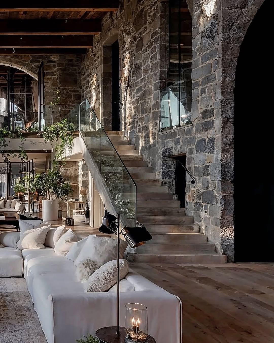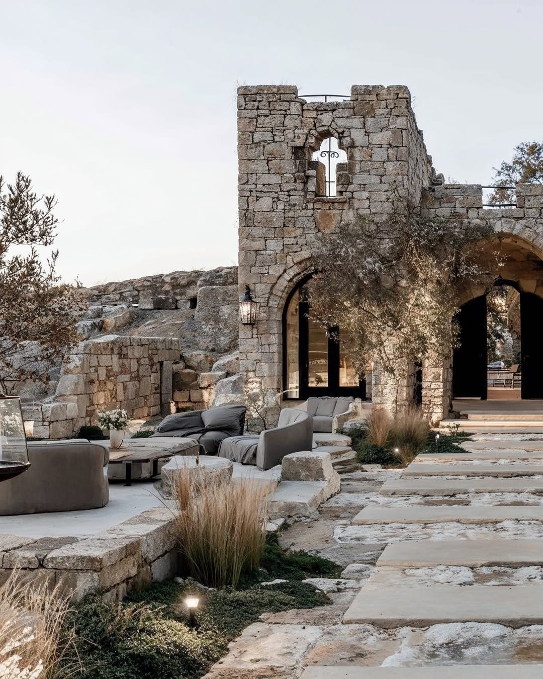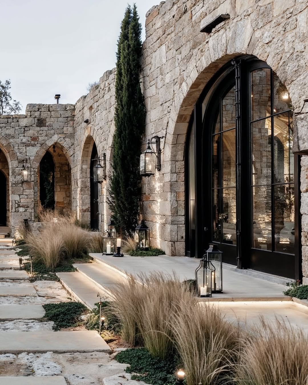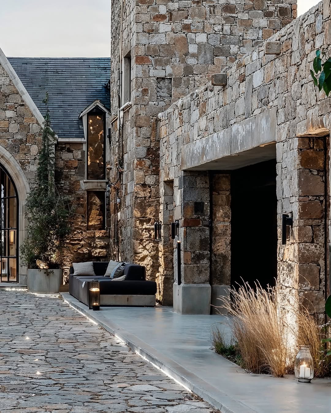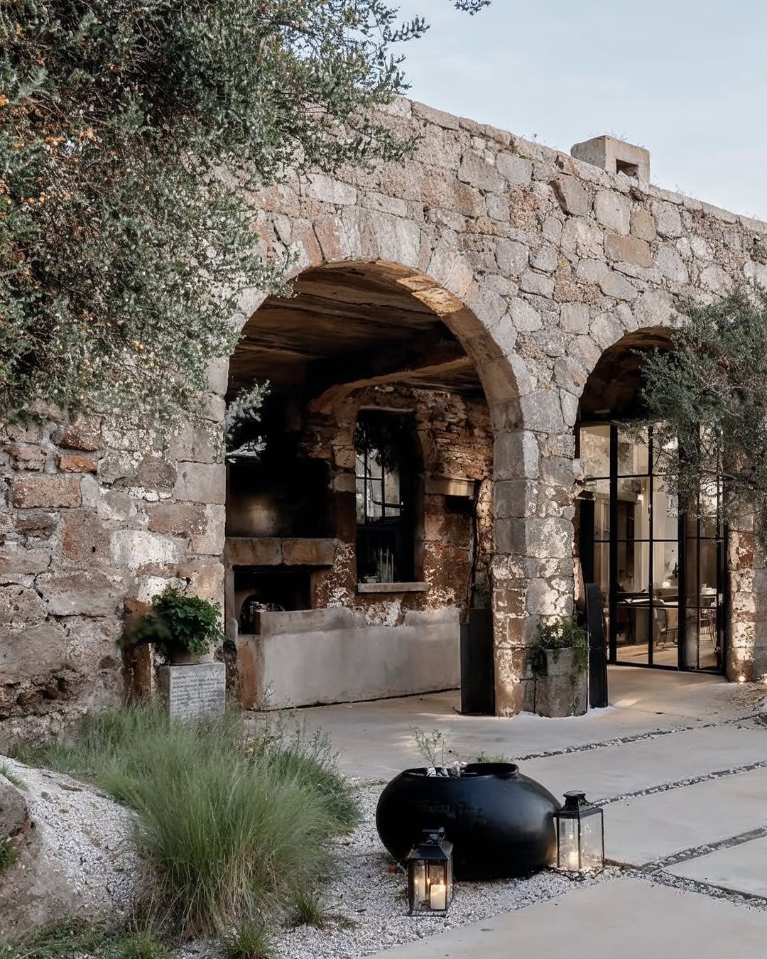 The building is built from natural stone, retaining almost the entire arched structure and thick walls of ancient Tuscany monasteries. The high arched windows and black steel-framed doors create a strong contrast between rough and clean. The stone-paved entrance, surrounded by olive trees, reeds and iron lanterns - has a classic Mediterranean feel.