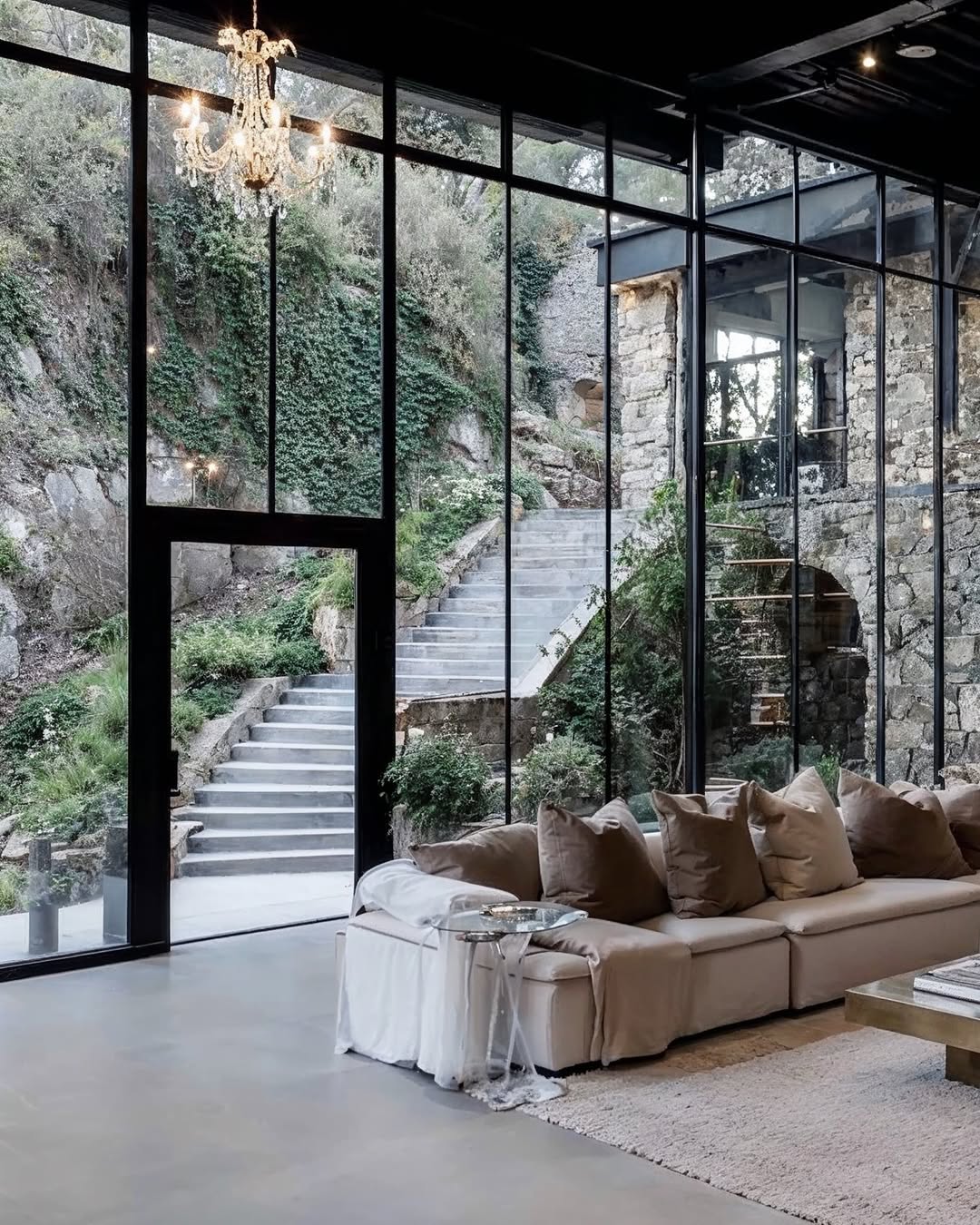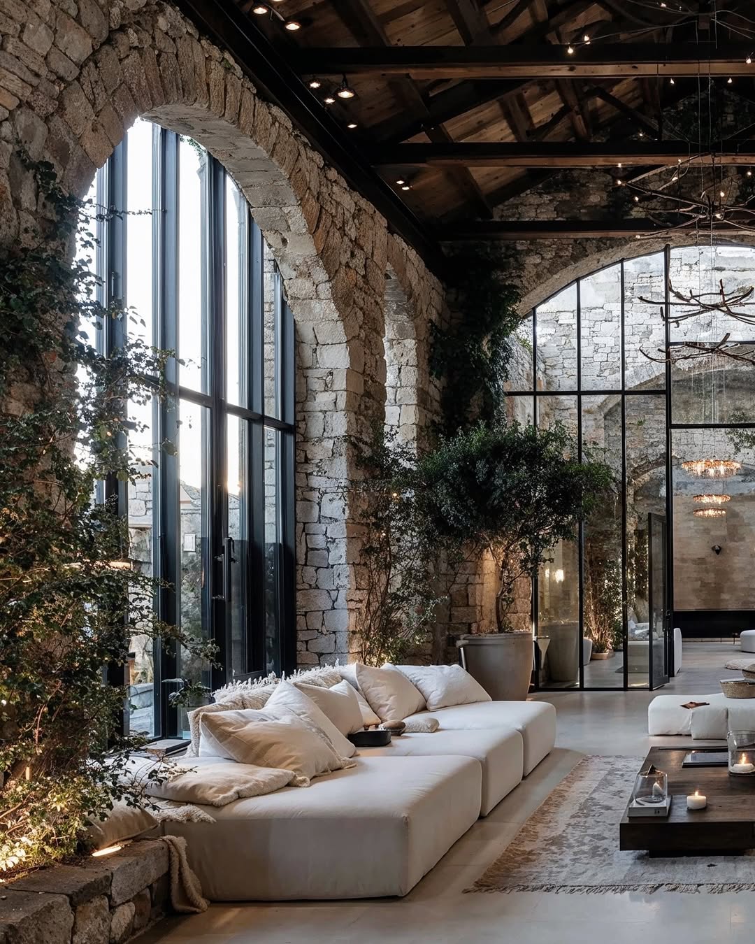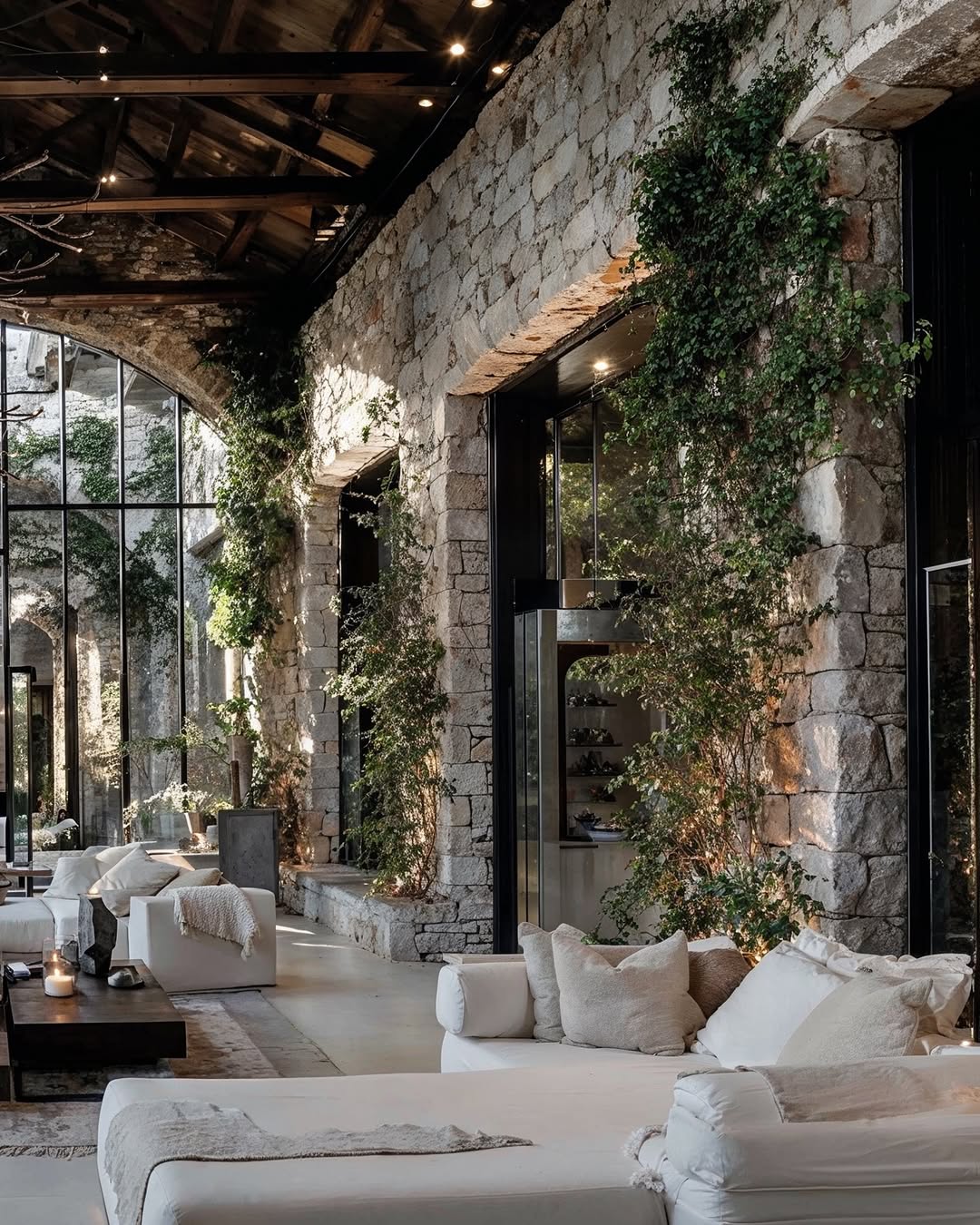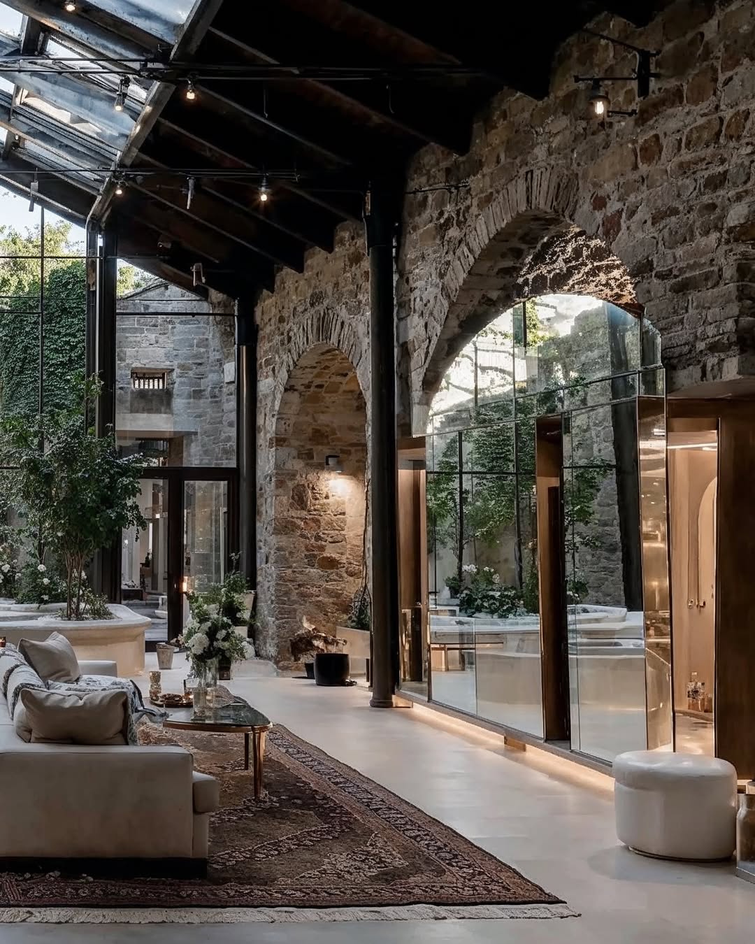 The building is built from natural stone, retaining almost the entire arched structure and thick walls of ancient Tuscany monasteries. The high arched windows and black steel-framed doors create a strong contrast between rough and clean. The stone-paved entrance, surrounded by olive trees, reeds and iron lanterns - has a classic Mediterranean feel.