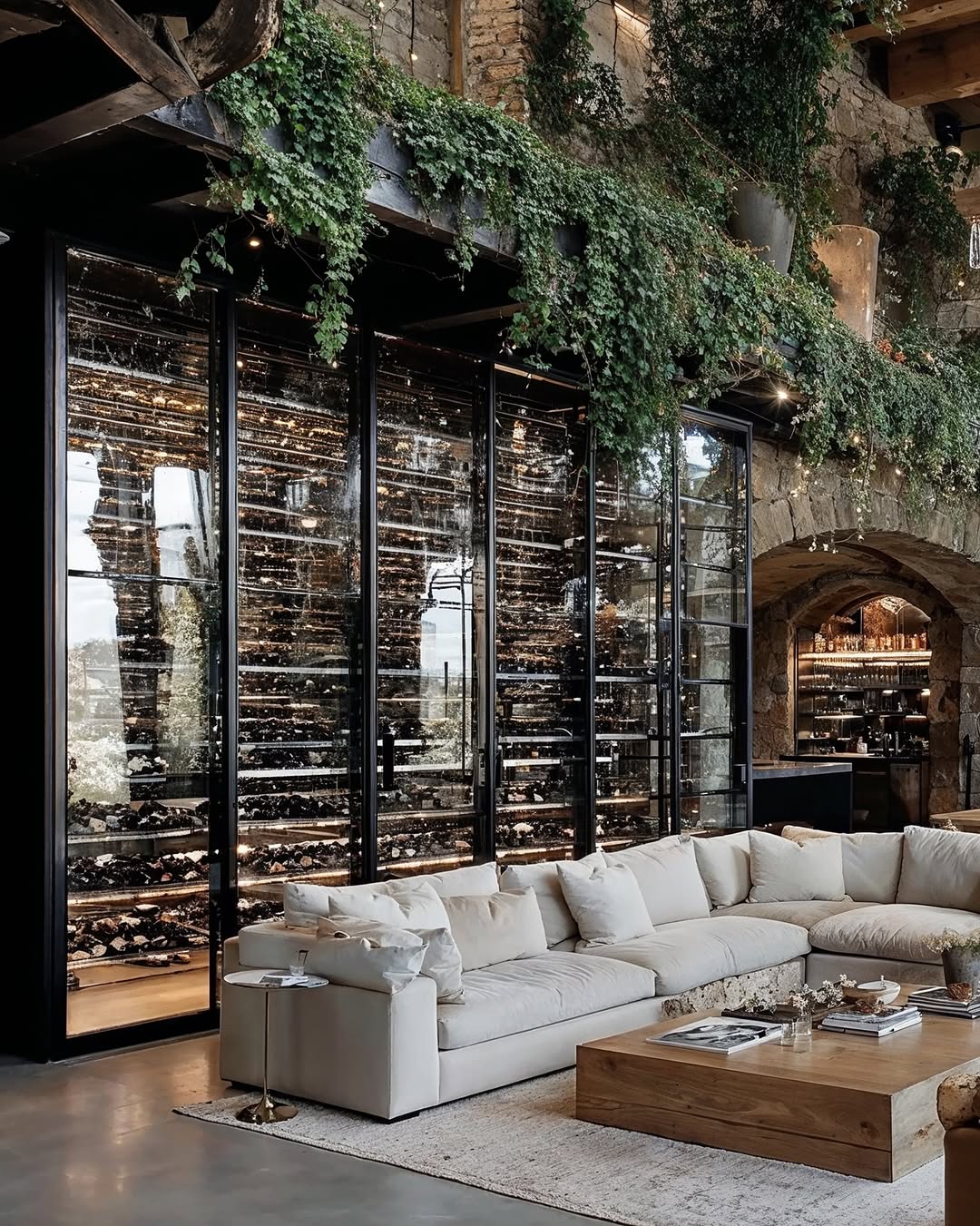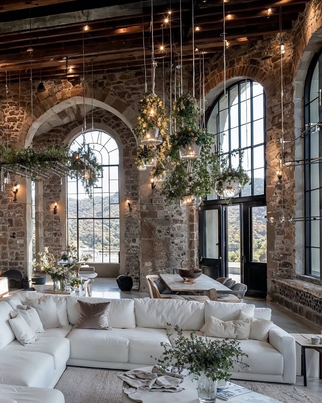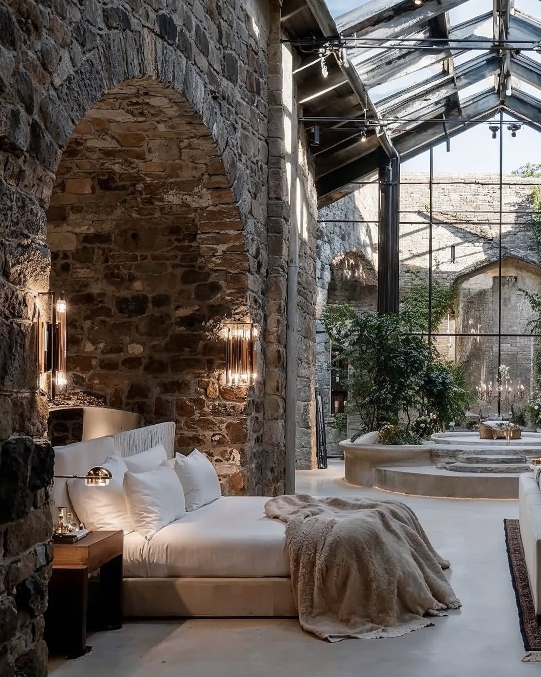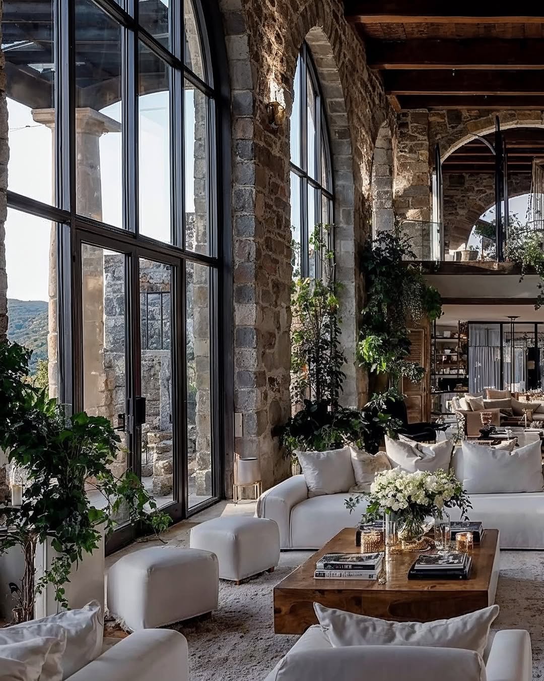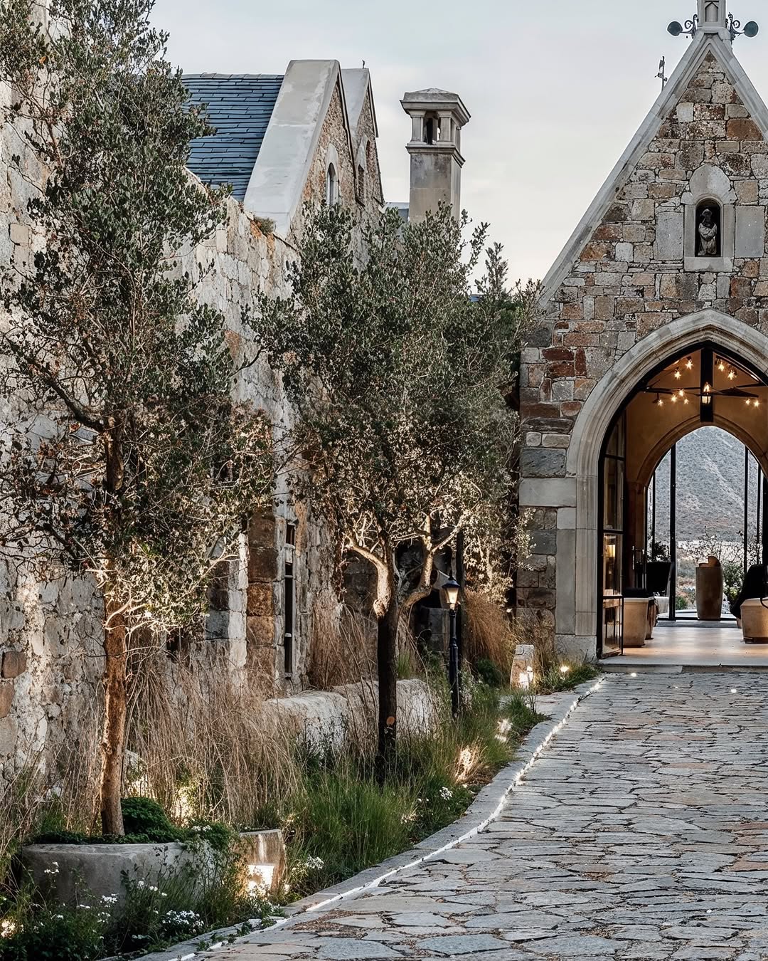 The building is built from natural stone, retaining almost the entire arched structure and thick walls of ancient Tuscany monasteries. The high arched windows and black steel-framed doors create a strong contrast between rough and clean. The stone-paved entrance, surrounded by olive trees, reeds and iron lanterns - has a classic Mediterranean feel.