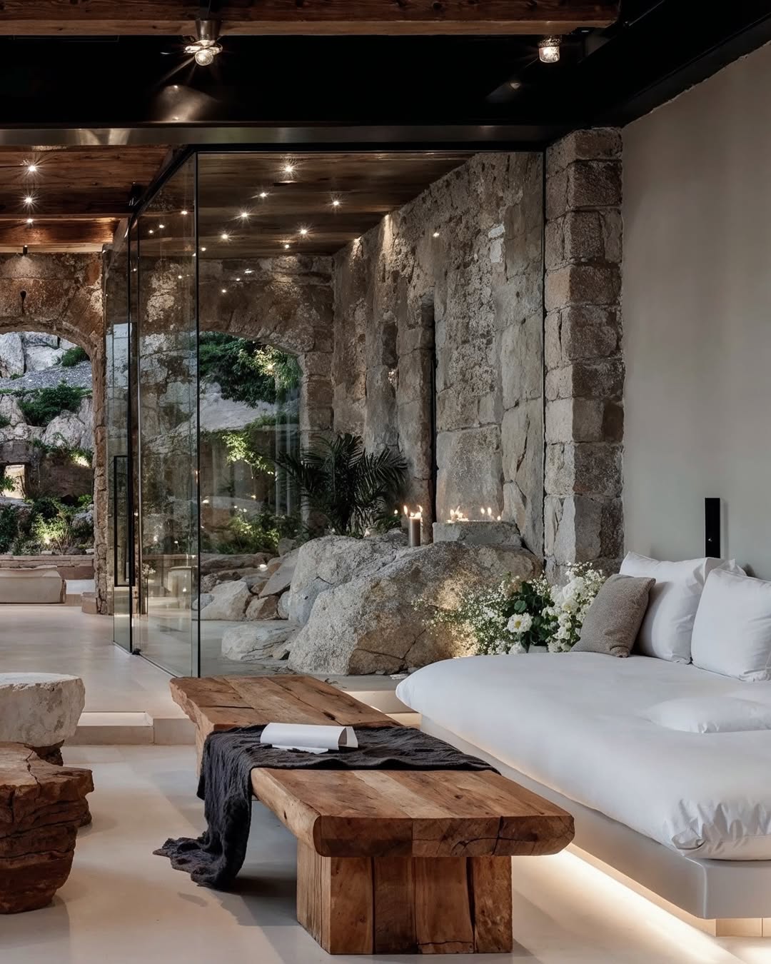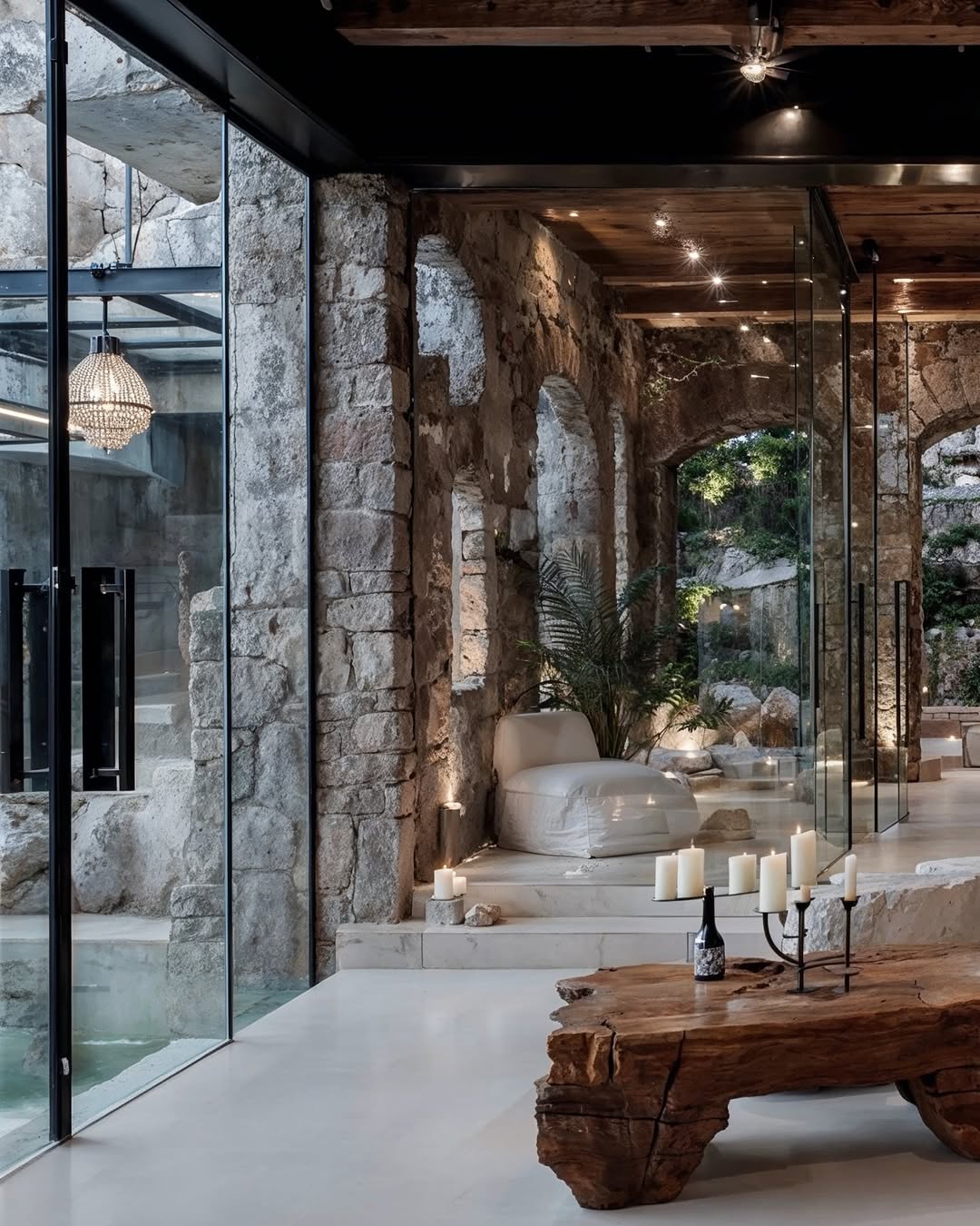 Outside is a terraced garden made of stone blocks, with ash-grey lounge chairs and natural, unadorned landscapes, creating a sense of harmony with the terrain. The afternoon light reflected through the glass highlights the golden color of the ancient stone – a cinematic visual effect.