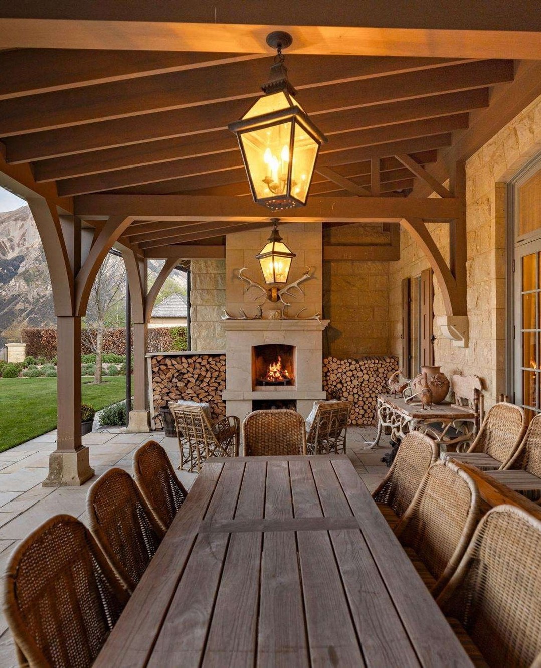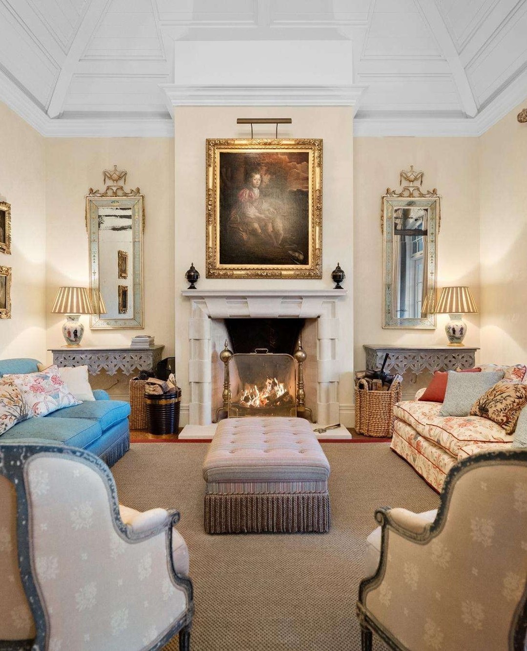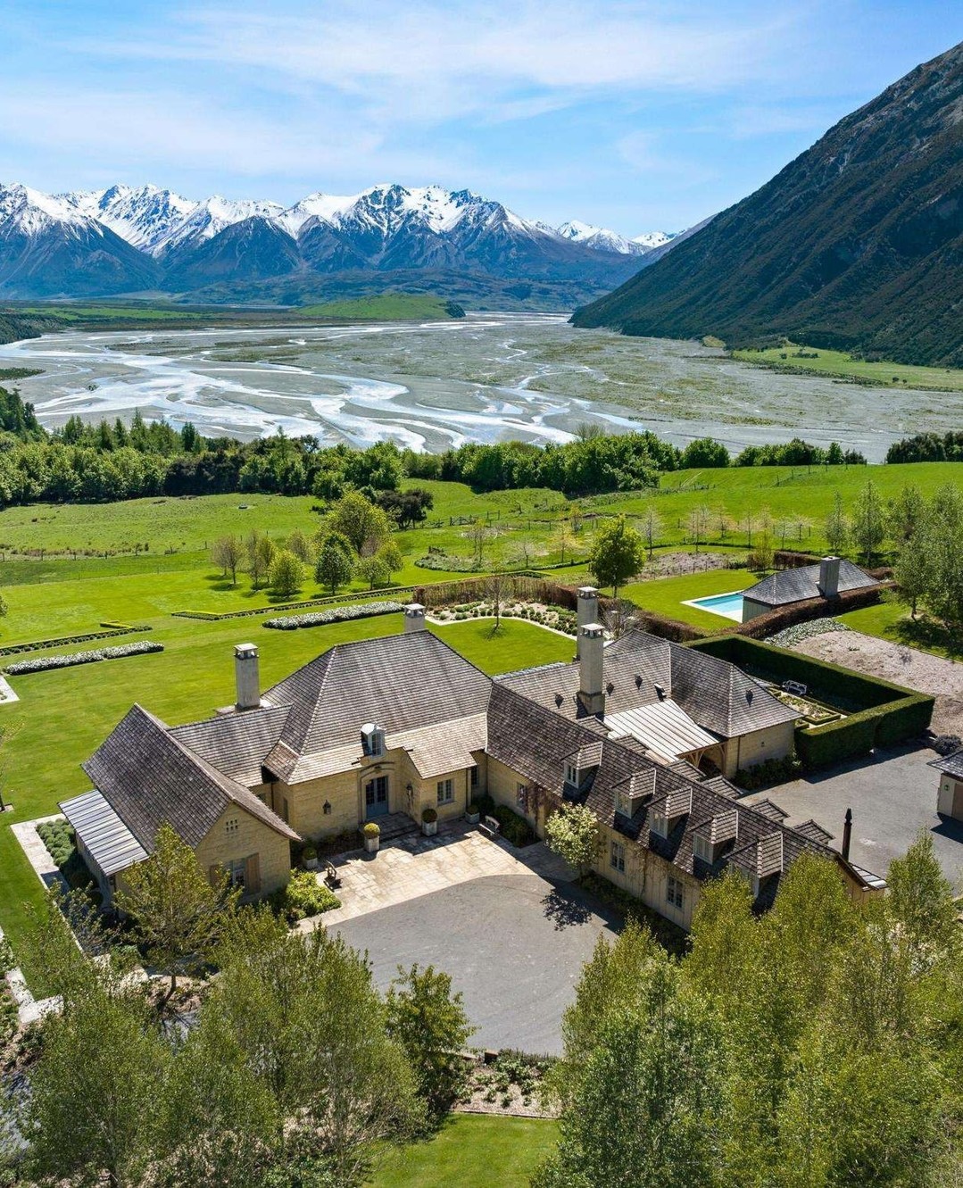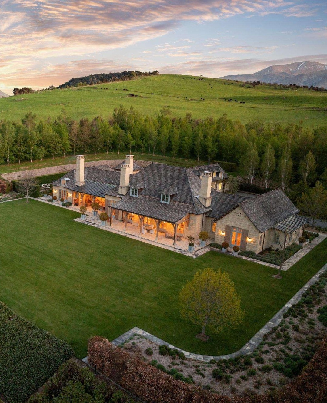At the heart of the estate is a charming country manor-style building with an old-fashioned timber roof, light-coloured stonework and a wide veranda overlooking the entire valley. Inside, the warm interior with stone fireplaces, vintage floral sofas, portraits and yellow lighting gives the space a luxurious yet rustic feel, very “European estate in the mountains of New Zealand”.